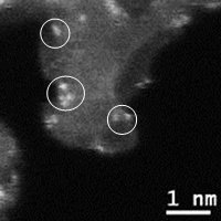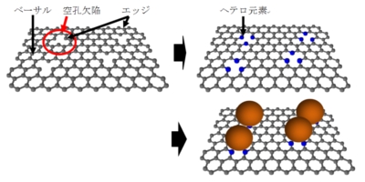 Fig. 4 @Introduction of hetero atoms at vacancy defects and coordination of metal ions and @STEM image of metal ion coordinated graphene [4-1] [4-1] Y. Yamada, M. Miyauchi, et al., "Exfoliated graphene ligands stabilizing copper cations", Carbon 49 (2011) 3375-3378. [4-2] Y. Yamada CY. Suzuki CH. Yasuda Cet al. C"Functionalized graphene sheets coordinating metal cations", Carbon 75 (2014) 81-94. (5) Dehydrogenation reaction of poly aromatic hydrocarbons We have prepared carbon materials by dehydrogenation of various poly aromatic hydrocarbons. (6) Clarification of mechanisms for migration of functional groups and their gasification Carbon materials contain functional groups in the basal plane and on edges. We have attempted to understand the mechanisms of migration of functional groups and their gasification upon heat treatment [6-1,6-2].