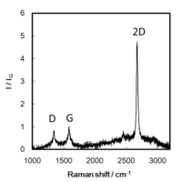 Fig. 1-1 Types of defects on graphene Fig. 1-2 TEM image of graphene  Fig. 1-3 Raman spectrum of graphene (1-2)Defective structure analysis using DFT calculation(XPS EIR): Various defects such as functional groups and point defects exist on edges and in the basal plane of carbon materials. Complete understanding of these defects is essential to maximize the properties of carbon materials. We have conducted simulation of XPS and IR spectra for oxygen-containing functional groups (Fig. 1-2-1)[1-2-1,1-2-2], nitrogen-containing functional groups [1-2-3], and other defects.