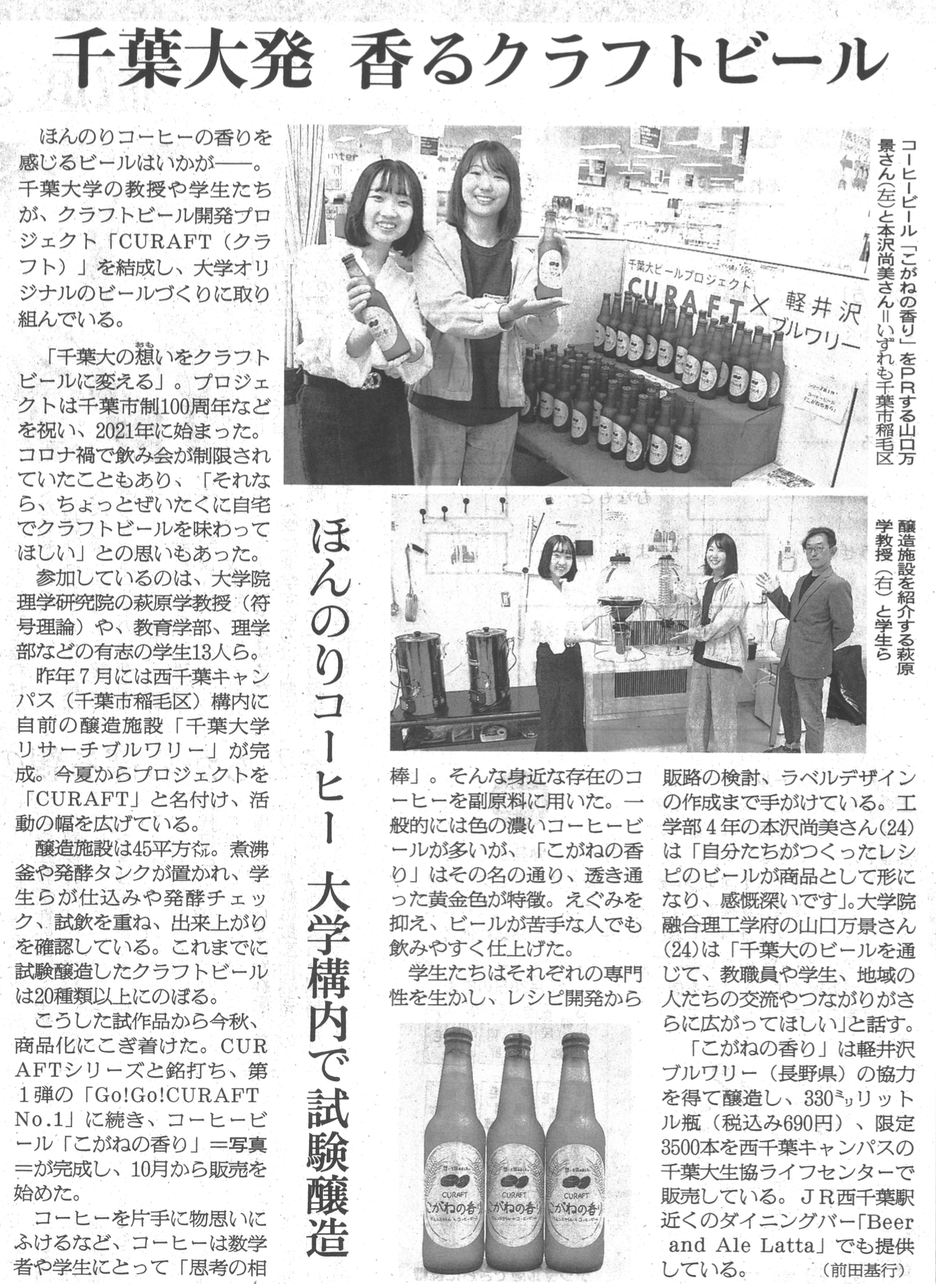 本コース4年生の本澤尚美さんが参加するクラフトビール開発プロジェクト「CURAFT(クラフト)」が朝日新聞朝刊(2025.10.29)に掲載されました。現在、西千葉キャンパスの千葉大生協ライフセンターでコーヒービール「こがねの香り」が数量限定で販売されています。